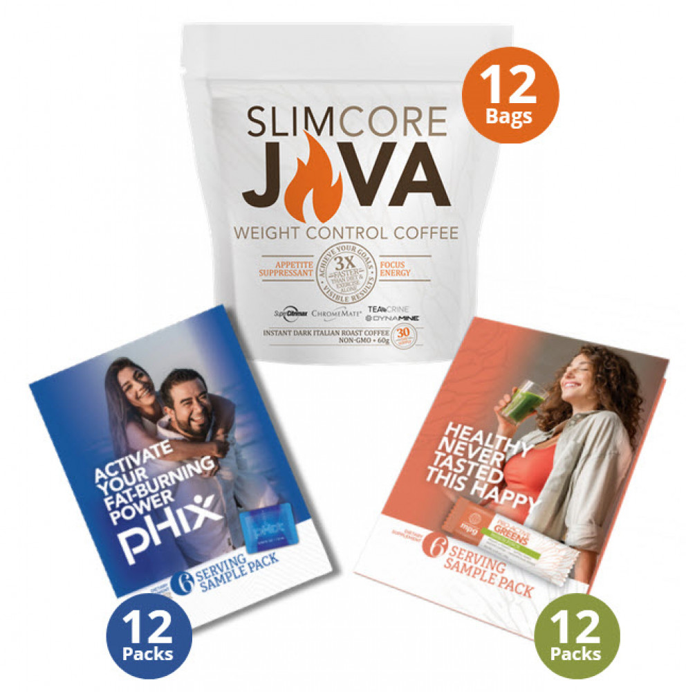 US - 12 Bag SlimCore Java, 12 Pack of Passion Punch Pro-Active Greens, 12 pHix Packs Enrollment Kit