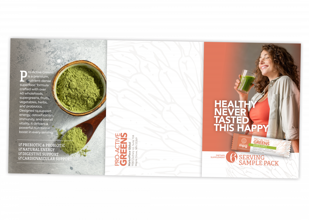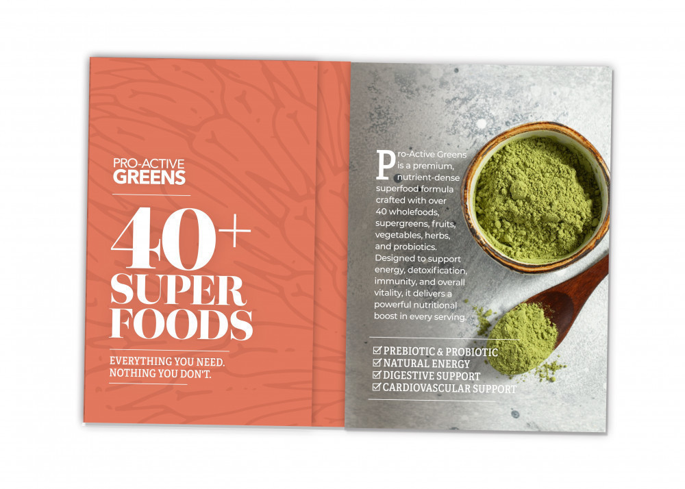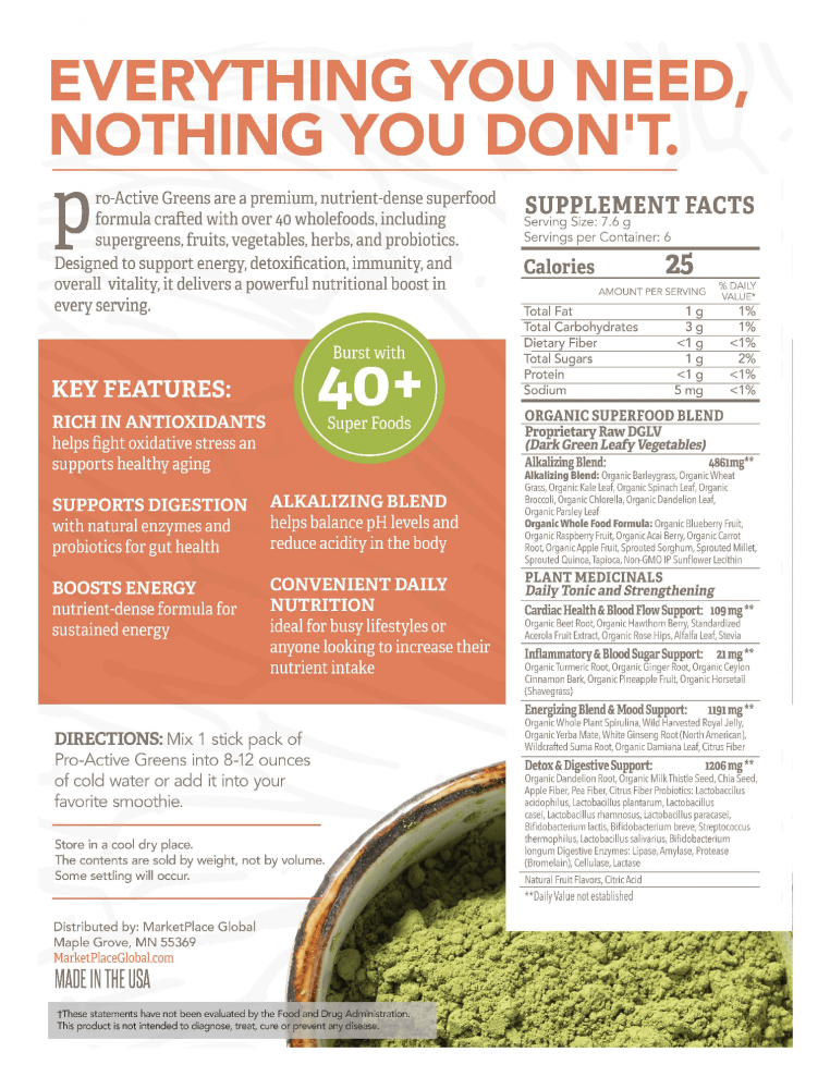 Pro-Active Greens is a great-tasting, plant-based superfood drink made with over 40 nutrient-dense ingredients including organic supergreens, fruits, vegetables, herbs, prebiotics, and probiotics. Each serving is designed to help you conveniently add more nutrition to your day — without complicated meal prep.