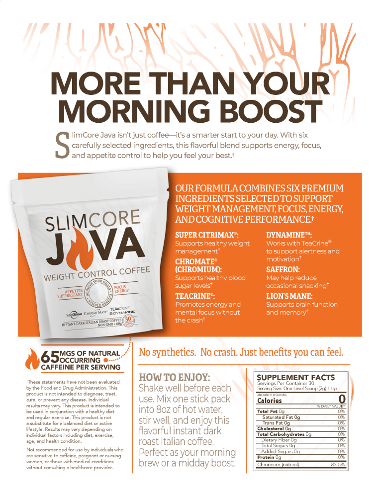 Core Java helps promote weight management with its metabolism-boosting, waistline-slimming instant coffee! Core Java is infused with two effective weight control ingredients to help you achieve your goals up to 3x faster than diet & exercise alone! Each morning, enjoy this delicious zero-calorie brew along with following a sensible diet and exercise. You'll quickly see the results you are looking for!